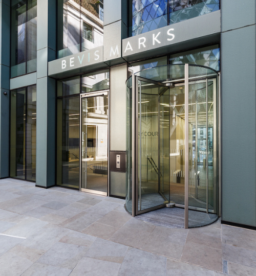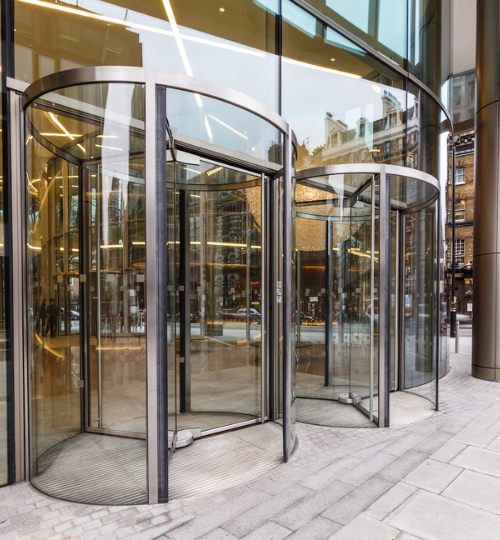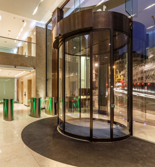 The Walbrook is a high-quality office headquarters in the heart of the City, featuring circular full-vision revolving doors and a custom sliding door, seamlessly integrated into the architectural façade.