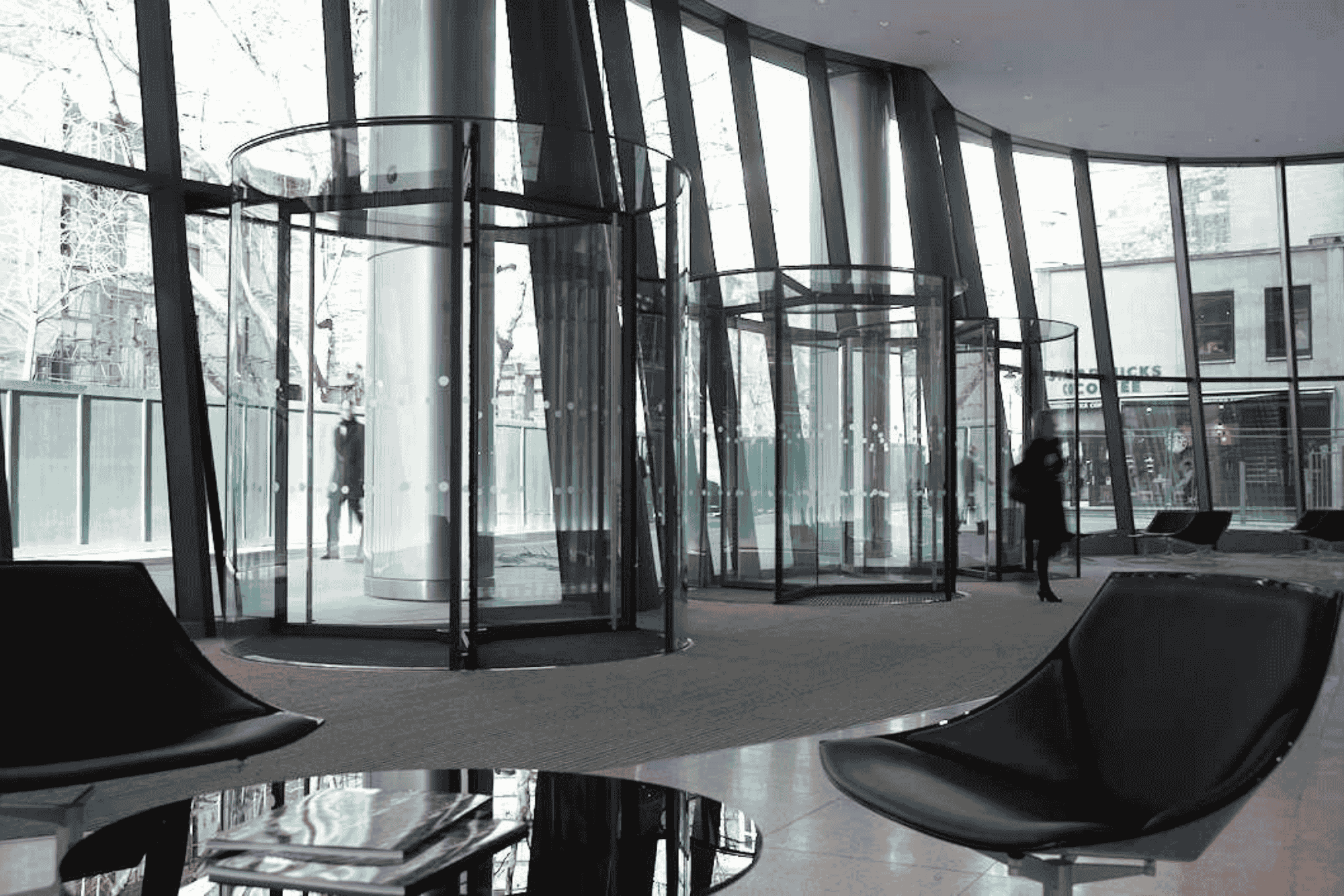BDS Entrances realiseerde een maatwerk entree-oplossing bestaande uit drie ronde Circular Full Vision CFV 2800 AY draaideuren, volledig verdiept geplaatst in de receptieruimte. Het architectonisch ontwerp vereiste een minimale profilering om ononderbroken zichtlijnen door het glas te behouden, wat resulteerde in een strakke en zeer transparante entreebeleving.